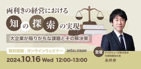 アスタミューゼ株式会社(本社:東京都千代田区、代表取締役社長 永井歩)は、2024年10月16日(水)12:00-13:00に、無料ウェビナー「両利きの経営における「知の探索」の実現 ~大企業が陥りがちな課題とその解決策~」を開催いたします。