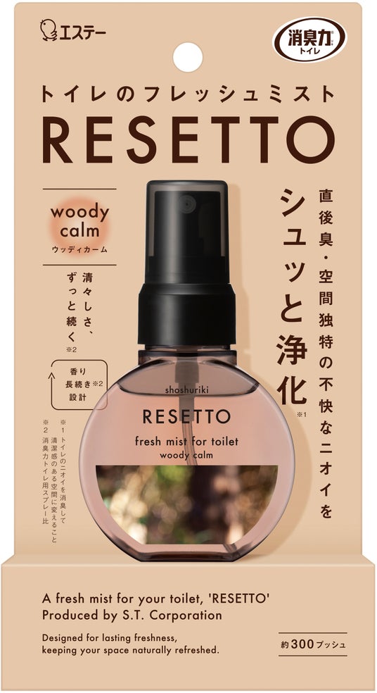 エステー株式会社は、トイレの気になるニオイをシュッと消し、一瞬で浄化(※1)されたようなフレッシュな空間に変えるミストタイプのトイレ用消臭剤「消臭力 トイレのフレッシュミスト RESETTO(リセット)」に、肩の力が抜けるような深いやすらぎの香り〈ウッディカーム〉を新たに追加し、「つめかえ」と共に3月12日から全国のスーパー、ドラッグストア、ホームセンター、ネットショップなどで新発売します。