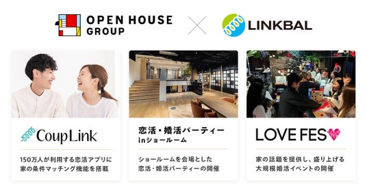 今後、東京・大阪での「LOVE FES」拡大開催、および、当社グループのショールームを会場とした恋活・婚活パーティーの開催、そして、リンクバルのマッチングアプリCoupLink(カップリンク)での「家の条件」マッチング機能の搭載といった、共同企画を実施いたします。