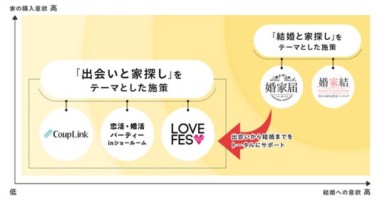 そこで、当社グループでは、「結婚と家探し」を紐づけ、ご結婚前後の方へ向けて、家の条件でお相手を探すマッチングサービス「婚家結」、婚約指輪の代わりに家を贈る誓約書「婚家届」を提供してまいりました。
