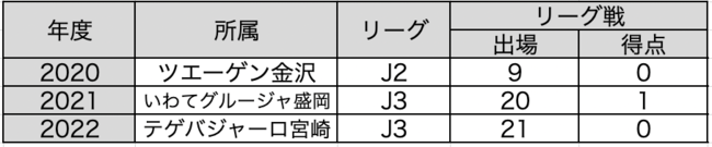 EXE'90FC - 関西大北陽高 - 大阪体育大 - ツエーゲン金沢 - いわてグルージャ盛岡(期限付き移籍) - ツエーゲン金沢 - テゲバジャーロ宮崎(期限付き移籍)