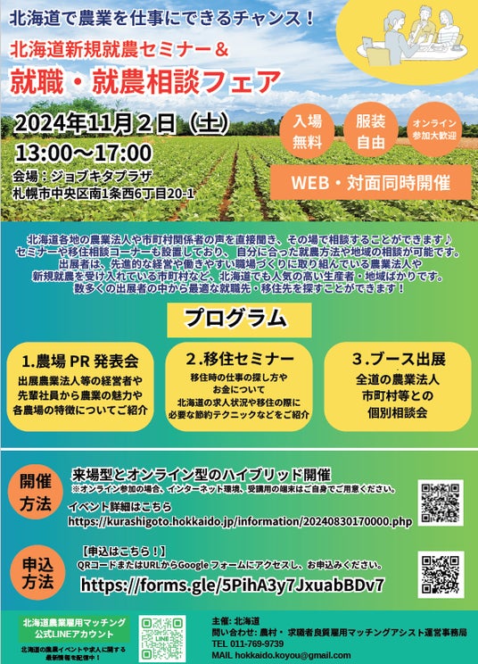 【2024年11月2日(土)】北海道で農業を仕事にできるチャンス!北海道新規就農セミナー&就職・就農相談フェアを来場型とオンライン型の同時開催!!