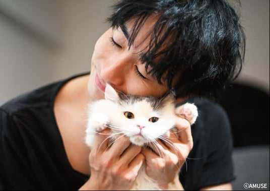 缶バッジとステッカーはカレンダーでは使用していない古屋と愛猫の写真を使用して作成。カレンダーでは見られない表情にも注目です。
