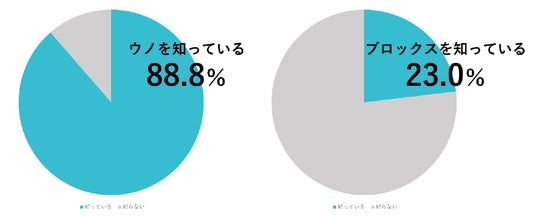 調査の結果、ウノの認知率が88.8%に対し、ブロックスの認知率は23.0%と60ポイント以上の差があり、2つのゲームに認知率の差があることが明らかになりました。