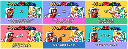 第1話では「ウノのように有名になりたい!」と打ち明けた“ブロックスくん”に対し、面倒見の良い先輩の“ウノさん”が有名にするべく相談にのるのですが、前のめりの“ブロックスくん”に、圧倒されタジタジの“ウノさん”。その他全5話のストーリーでは、ブロックスにも「ウノって言ってない!」のようなルールを検討したり、“ブロックスくん”の魅力を伝えるべく自己紹介を磨いたり、二人で大奮闘。ムービーにてその様子をご覧いただくことで、より「ウノ」や「ブロックス」を楽しんでいただける内容となっております。