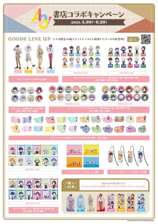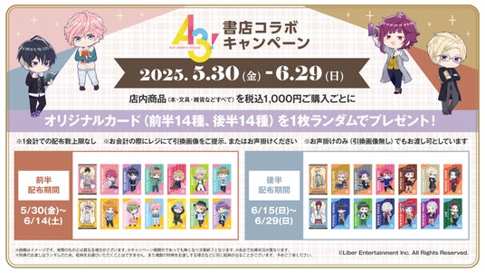 日本出版販売株式会社(代表取締役社長:富樫 建、略称:日販)は、株式会社リベル・エンタテインメント(代表取締役社長:林田 浩太郎)が運営するイケメン役者育成ゲーム『A3!(エースリー)』との書店コラボキャンペーンを、2025年5月30日(金)より全国567書店にて開催します。