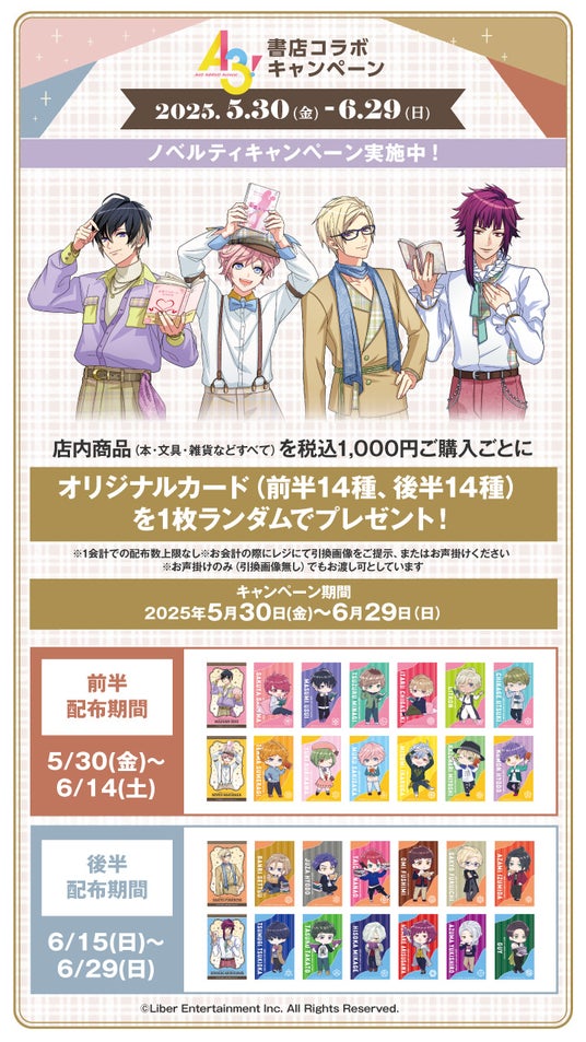 キャンペーン期間中、対象書店で商品のご購入時に所定の引換画像をご提示、もしくはレジにてお声掛けいただいた方へ、購入金額1,000円(税込)につき1枚、描き下ろしイラストを使用したオリジナルカードをランダムでプレゼントします。
