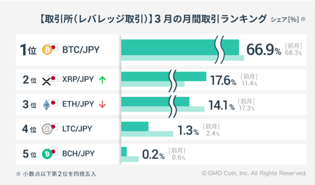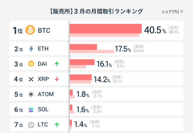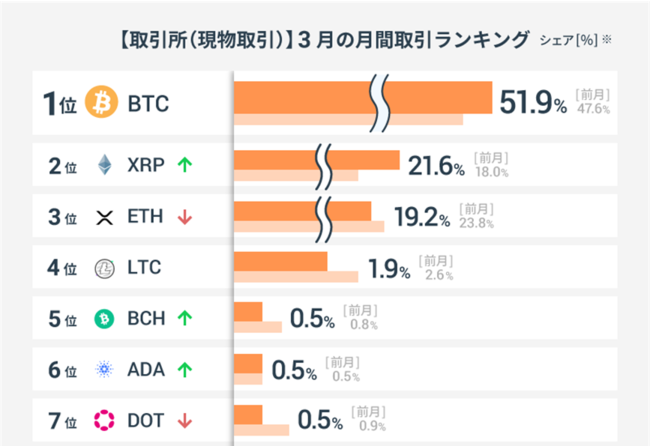 前月2月のランキングと比較すると、「取引所(現物取引)」同様に3月に価格が大きく上昇したリップル(XRP)のシェアが拡大し、イーサリアム(ETH)を抜いて2位にランクインしました。