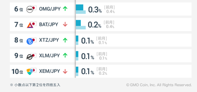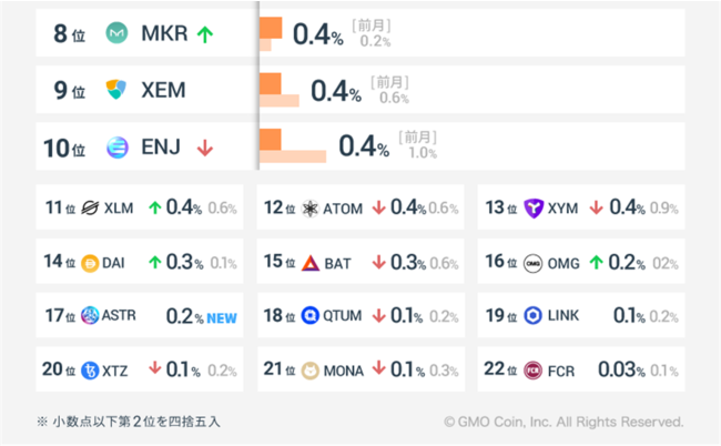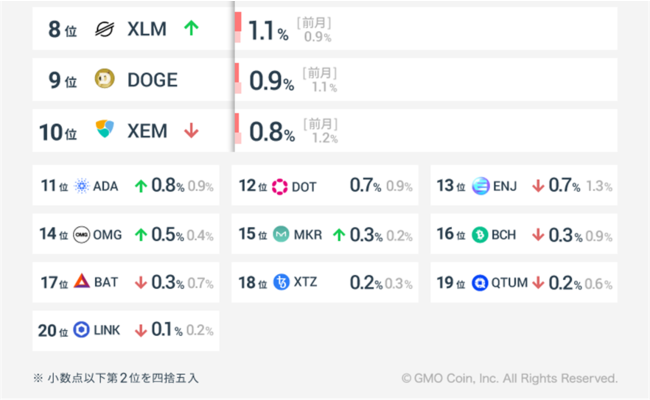 前月2月のランキングと比較すると、3月に価格が大きく上昇したリップル(XRP)のシェアが拡大し、その分イーサリアム(ETH)のシェアが減少する結果となりました。