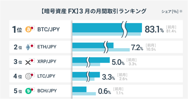 「暗号資産FX」では、ビットコイン(BTC)/JPYがシェア83.1%で1位となりました。