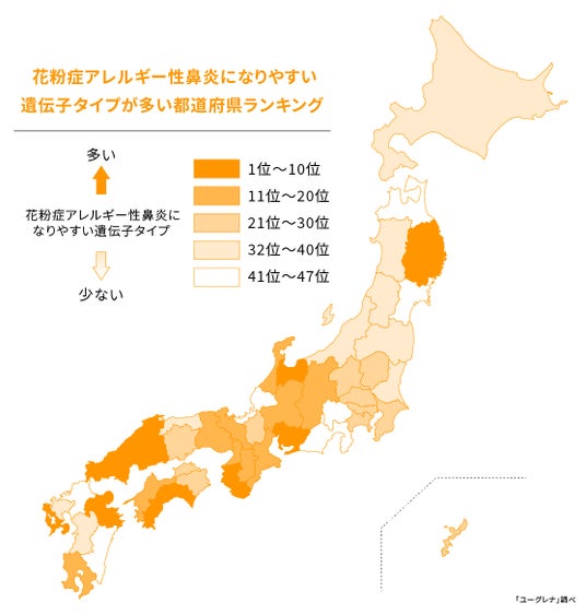 株式会社ユーグレナ(本社:東京都港区、代表取締役社長:出雲充)は、ユーグレナ・マイヘルスとジーンクエストの遺伝子解析サービスのゲノムデータをもとにした「花粉症アレルギー性鼻炎になりやすい遺伝子タイプが多い都道府県※1ランキング」を公開します。春の花粉シーズンは終了に近づいたものの、次は、シラカバやイネ科の花粉、夏から秋には草の花粉が多く飛びます。今は花粉症を発症していない方も、今後、発症を防ぐための対策にお役立てください。