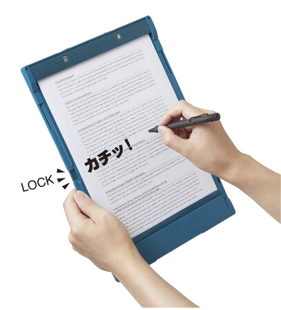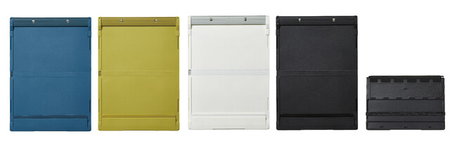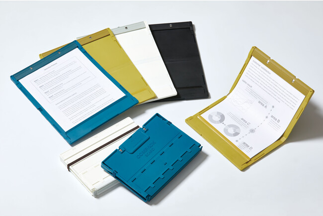 書類をコンパクトに折りたためる「コンパック」シリーズは累計82万冊を販売する人気シリーズで、この度新たに「コンパックボード」を追加します。「コンパックボード」は、半分に折りたためるクリップボードです。本体を半分に折りたたみ、ゴムバンドで固定できるため、A4サイズが入らないカバンにも収納できます。また、ボードを開くと自動で筆記面がフラットになり固定されるため、開いた状態で筆記ができます。本体は内側に折りたたむ構造で、書類の中身を見せずに収納することができ、カバンの中で書類を汚れなどから保護します。収納枚数は約15枚で、折り目を付けずに大事な書類もキレイに収納できます。本体に収納可能なペンホルダーも付いており、ペンと一緒に持ち運ぶことができます。工事現場、医療・介護現場、展示会・街頭アンケートなどで活躍します。カラーはアオ、キイロ、シロ、クロの4色展開です。
