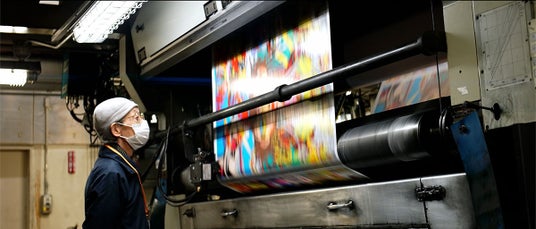 グラビア印刷を視察する田名網敬一。2021年11月撮影。(協力/TOPPAN)