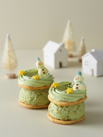 ピスタチオづくしのチーズクリームをやわらかいクッキーでサンド。ピスタチオシャンティとお星さまチョコレート、スノーマンを飾ってデコレーションしました。