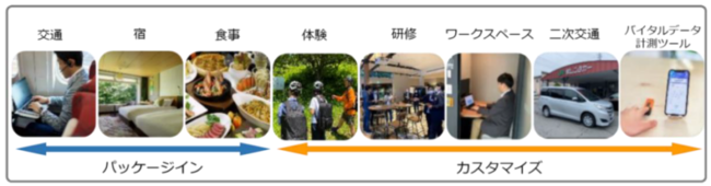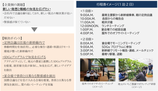 当商品は、チームビルディング型研修をメインテーマとして交通・宿・食事・ワークスペース・ボランティア・アクティビティ・バイタルデータ計測ツールなど、必要なもののみを選択してカスタマイズできるセミオーダー型の研修プランです。新人研修や少人数向け、経営層向けなど対象者や規模に合わせて課題解決をサポートする研修スタイルをご提案いたします。