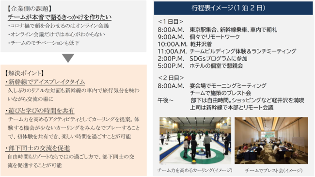 株式会社西武・プリンスホテルズワールドワイド(本社:東京都豊島区、代表取締役社長:小山 正彦/以下「プリンスホテル」)と、東日本旅客鉄道株式会社(本社:東京都渋谷区、代表取締役社長:深澤 祐二/以下「JR東日本」)は、2020年12月より進めている株式会社西武ホールディングスとJR東日本の包括的連携のもとワーケーションの取り組みを推進しており、このたびその一環として、リゾート地での体験プログラムを通じて企業の人事課題解決をサポートする「短期型チームビルディング研修」をご提案いたします。