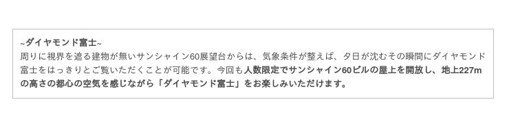 ※サンシャイン60展望台では、太陽の一部が山頂の一角にさしかかっている状態を「ダイヤモンド富士」としており、ちょうど山頂に太陽が重なる日の前後も観覧可能期間としています。
