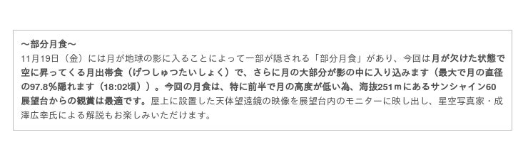 詳しくはHPをご確認下さい。( https://sunshinecity.jp/observatory/ )