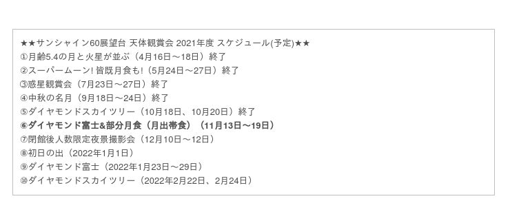 SKY CIRCUS サンシャイン60展望台(東京・池袋)では2021年度、天体観賞会を10回実施予定です(下部参照)。