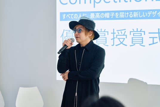 その中で、フランスで日本の人間国宝に相当する“M.O.F.”を持つ日爪ノブキさんに出会い、一緒に最高の縫製ハサミを製作する共創プロジェクトが始まりました。日爪さんとの出会いによって「全ての人に、”最高の帽子を届ける”」をミッションに、新しい帽子文化の創出と次世代の帽子デザイナーの育成を目的としたデザインコンテストを開催させていただいております。」とご説明いたしました。