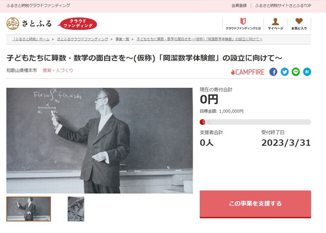 和歌山県橋本市とふるさと納税ポータルサイト「さとふる」(https://www.satofull.jp/)を運営する株式会社さとふる(本社:東京都中央区、代表取締役社長:藤井 宏明)は、寄付金の使途に応じて事業を立ち上げ寄付を募る「さとふるクラウドファンディング」(https://www.satofull.jp/projects/top.php)にて、橋本市にゆかりのある世界的数学者、岡潔博士を称えその偉業を継承するとともに、子どもたちへ算数・数学の面白さと意義を伝えるための体験館設立を目指し、2023年2月1日より寄付受け付けを開始します。