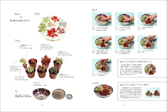 12ヶ月を通し、その月々に園芸店の店頭で販売されている植物を組み合わせて作る、多肉植物の寄せ植えの工程を、写真とともに詳細に解説します。