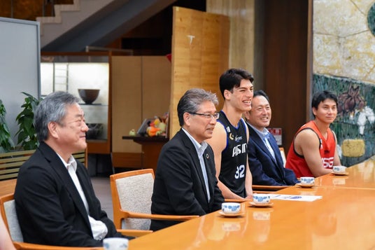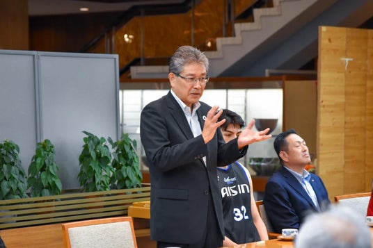 シーホース三河からは取締役社長 寺部康弘と#32シェーファーアヴィ幸樹選手が同席し、日頃からご支援いただいていることへの御礼と、2024-25シーズン開幕に向けた意気込みをお伝えするとともに、2028年に建設予定の新アリーナ建設の進捗状況も合わせてご報告させていただきました。