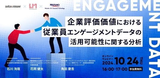 アスタミューゼ株式会社(本社:東京都千代田区、代表取締役社長 永井歩)は、2024年10月24日(木)16:00-17:00に、株式会社リンクアンドモチベーション (本社:東京都中央区、代表取締役会長:小笹 芳央)、みずほ第一フィナンシャルテクノロジー株式会社(本社:東京都千代田区、代表取締役社長:安原 貴彦)と共同で、金融機関向けの無料ウェビナー「企業価値評価における従業員エンゲージメントデータの活用可能性に関する分析」を開催いたします。