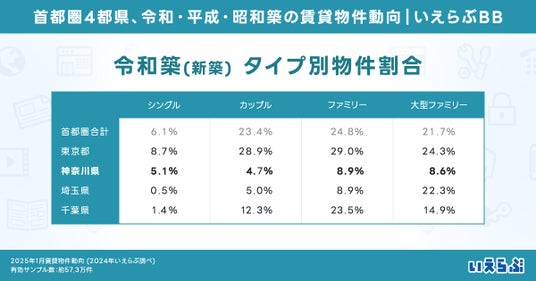 また、令和築の物件についてもシングルタイプでは東京に次いで5.1%と多いものの、その他のタイプでは4県中最も少ない結果となりました。