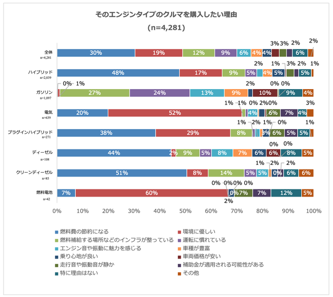 エンジンタイプ別で見ると、ガソリンは「燃料補給する場所などのインフラが整っている」と「運転に慣れている」を合わせると半数になりましたが、ガソリン以外は「燃料費の節約になる」と「環境に優しい」の合計比率が5割~7割を占めており、理由に違いが見られました。