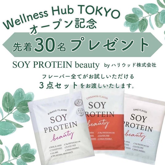 ハリウッド株式会社(本社:東京都港区六本木)は、『Wellness Hub TOKYO』のオープンにあたり、女性の美と健康のためのヴィーガンプロテイン「ソイプロビューティ」で協賛し、女性の健康と笑顔を引き続き応援いたします。