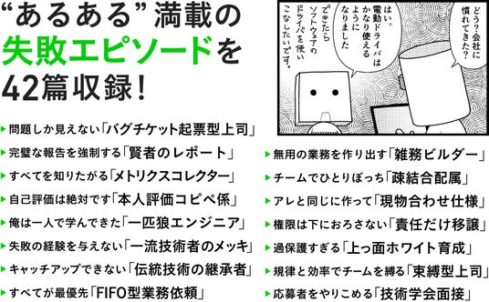 架空の開発現場を舞台にした各エピソードは、冒頭に4コマ漫画を掲載しており楽しく読むことができます。また、「失敗がなぜ起きたか?」を、図を交えて解説し、最後には失敗につながる落とし穴を回避する方法や、抜け出すための方法をまとめています。