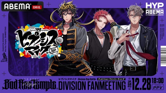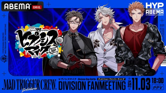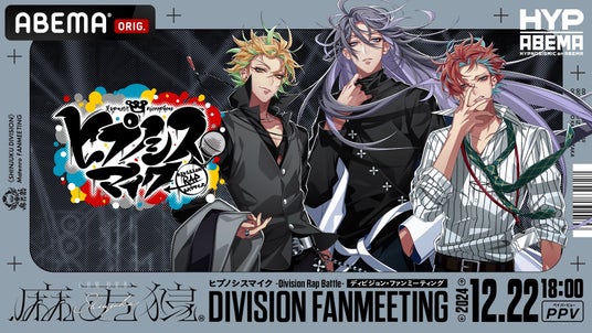 新しい未来のテレビ「ABEMA」は、『ヒプノシスマイク -Division Rap Battle-』(以下『ヒプノシスマイク』) “初”のファンミーティング『ヒプノシスマイク -Division Rap Battle- ディビジョン・ファンミーティング』(以下『ヒプノシスマイク ディビジョン・ファンミーティング』)の全7公演を「ABEMA PPV(アベマ ペイパービュー)」にて独占生配信することを決定いたしました。また、12月開催のシンジュク・ディビジョン、ナゴヤ・ディビジョン公演のチケット販売を、本日2024年10月15日(火)12時より開始することをお知らせいたします。