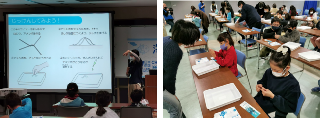 参加者は、「(アメンボから)離れたところに垂らしたのに沈んじゃった。ちょっと垂らしただけなのに」と話しました。環境が少し変わるだけで生きていけない生き物がいることが良く分かる実験でした。