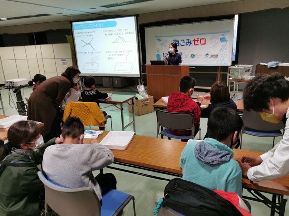 海と日本プロジェクトin岐阜県実行委員会は、県内の小学生を世界淡水魚水族館「アクア・トトぎふ」に招待し、海洋ごみの問題について学ぶ学習イベントを2021年12月11日(土)に開催しました。2021年度最後の開催となる第4回の今回は、アクア・トトぎふのスタッフから「川の水質とごみ問題」についての講義を受け、その後、ワイヤーをアメンボに見立てて水の汚れが生物にどのうような影響を与えるか実験を行いました。