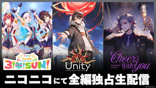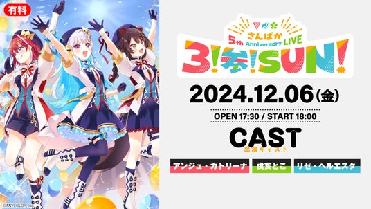 株式会社ドワンゴは、ライブ配信サービス「ニコニコ生放送」で、2024年12月6日(金)~12月8日(日)の3日間にわたり、VTuber/バーチャルライバーグループ「にじさんじ」の音楽ユニット「さんばか」(アンジュ・カトリーナ/戌亥とこ/リゼ・ヘルエスタ)の結成5周年記念ライブ「さんばか 5th Anniversary LIVE ~3!参!SUN!~」、三枝明那の初ソロライブ「Saegusa Akina 1st Solo LIVE "Unity"」、不破湊の初ソロライブ「不破湊 1st LIVE “Cheers with you”」の3公演を会場の武蔵野の森総合スポーツプラザより国内独占生配信します。さらに、各ライブを盛り上げる企画番組として「会場突撃レポート」と「最速感想放送」を配信します。