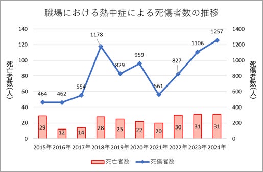 近年、熱中症での救急搬送者数は増加しています。特に、2024年の職場における熱中症の発生状況について、死亡を含む休業4日以上の死傷者数は1,257人と、統計を取り始めた2005年以降最多、うち死亡者数は31人(※1)となっており、厚生労働省からは、各事業場で熱中症予防について対策を講じるよう発信されています(※2)。