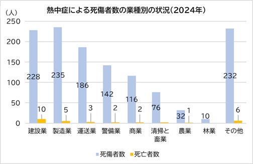 また、2024年の熱中症による死傷者数について業種別に見てみると、製造業が235名、次いで建設業が228名、運送業が186名と多いことが明らかとなっています。