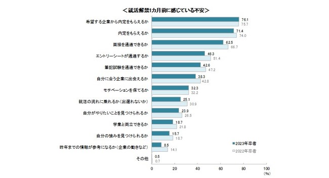 ○「希望する企業から内定をもらえるか」76.1%、「内定をもらえるか」71.4%に集中