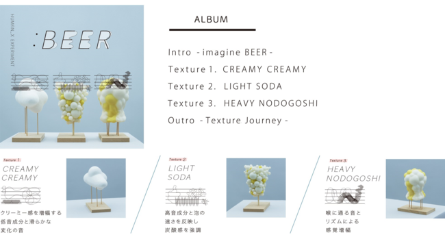 飲む前に聞いて期待感を高めるイントロから、「クリーミー感を増幅する音楽」「炭酸感を強める音楽」「のどごし感を増幅する音楽」と、一連の楽曲を聞きながらビールを味わうことで、時間の経過も含めた新たなおいしさを体験することができます。