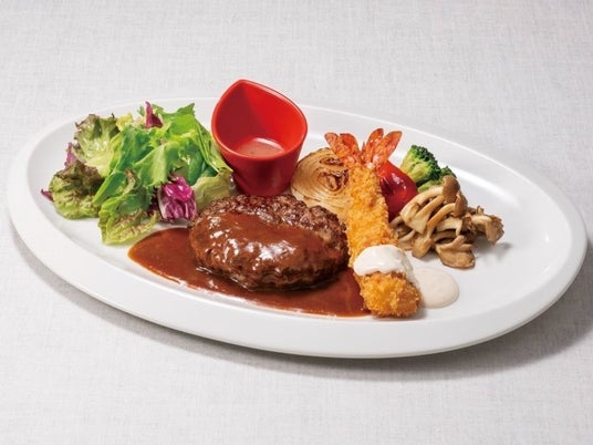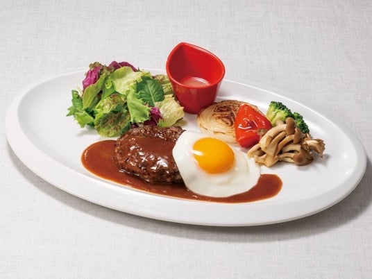 牛肉の旨みを最大限に引き出すため厳選した部位を使用し、つなぎを極力抑えた牛肉100%のハンバーグ。トッピングの大葉おろしと、すりおろし玉ねぎを加えたさっぱり特製和風ソースが相性抜群です。