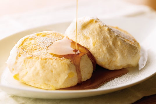 “スプーンで食べるパンケーキ”数ある『むさしの森珈琲』のメニューの中で人気No.1を誇る、こだわりの「“むさしの森珈琲特製”ふわっとろパンケーキ」。リコッタとクリームチーズのライトなコクがおいしさのポイント。
