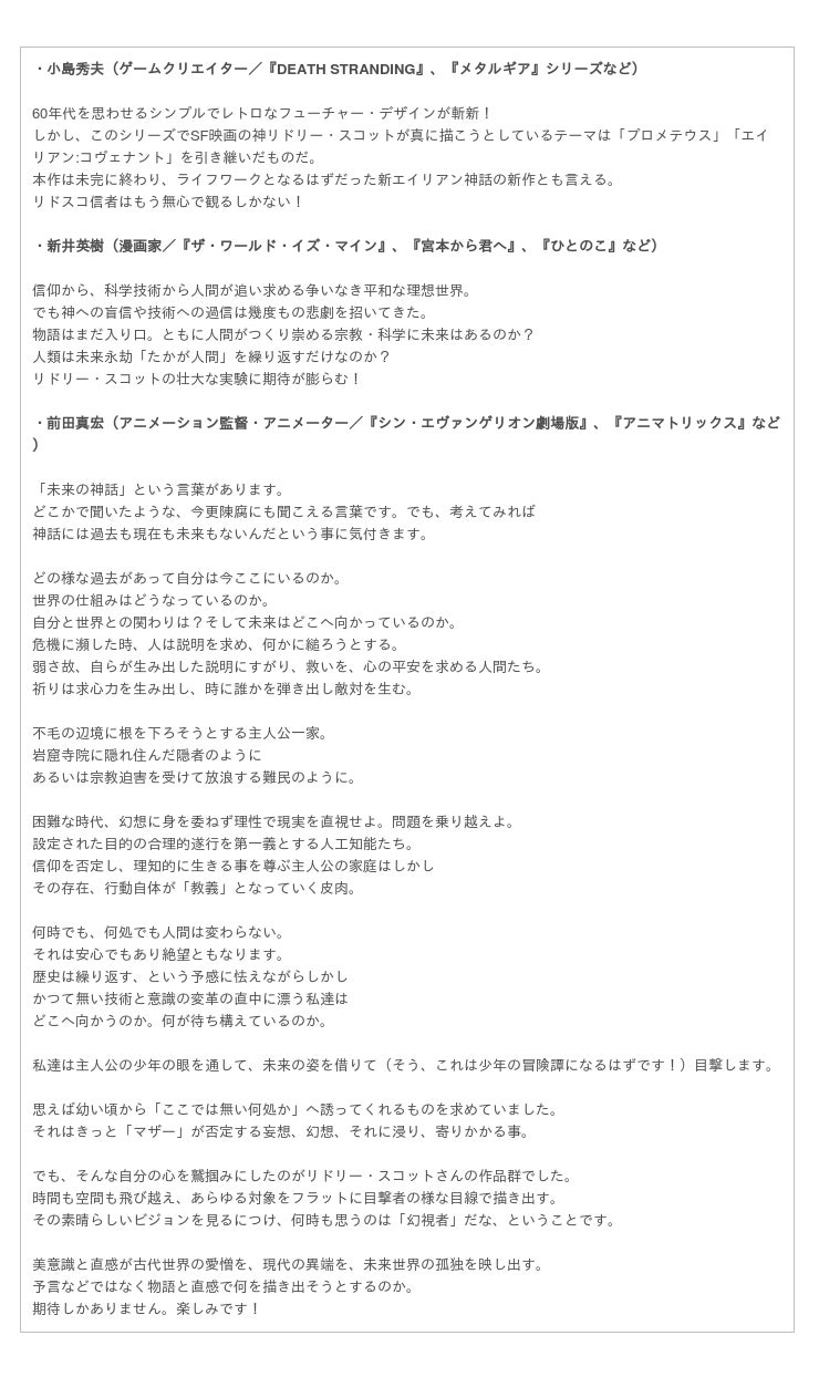 各界のトップクリエイターが絶賛!ゲームクリエイターの小島秀夫、漫画家の新井英樹、アニメーション監督の前田真宏より熱いコメントが到着!