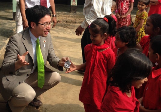 バングラデシュの小学校でユーグレナクッキーを配布する当社社長の出雲(『ユーグレナGENKIプログラム』を開始した頃)