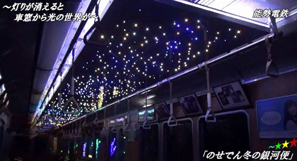 「冬の銀河便」は、車内の天井にイルミネーションで冬の星座をかたどり、期間限定で笹部駅~光風台駅間のトンネル付近で車内灯を消灯して、夜空に輝く星のキラメキを楽しんでいただきます。また、笹部駅や妙見口駅をイルミネーションで飾るとともに、笹部駅~光風台駅間のトンネル付近にはイルミネーションによる「天の川」を出現させます。