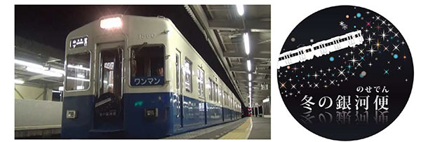能勢電鉄では、山下駅~妙見口駅間に「冬の銀河便」(2両編成車)を運行します。