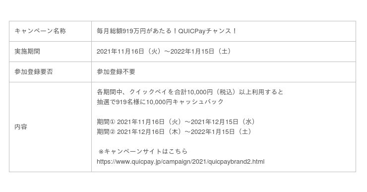 株式会社ジェーシービー (本社:東京都港区、代表取締役会長兼執行役員社長:浜川 一郎、以下JCB)は、2021年11月16日(火)から2022年1月15日(土)まで、「毎月総額919万円があたる!QUICPayチャンス!」を実施します。