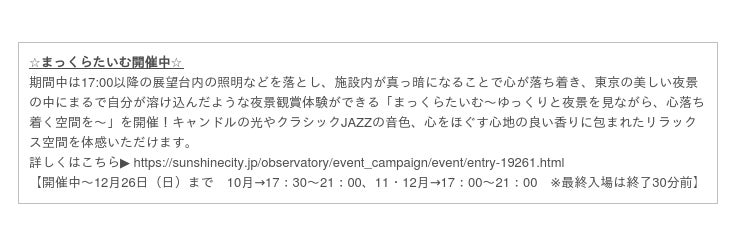 ※サンシャイン60展望台ではお客様に安心してご来館いただくため、新型コロナウイルス感染症拡大防止に努めております。ご来館の際には、ご理解とご協力をお願いいたします。詳しくは展望台 ウェブサイトをご確認ください。https://sunshinecity.jp/observatory/news/entry-15407.html