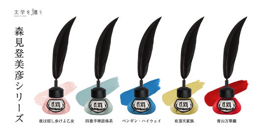 森見登美彦作品の不思議でユーモラスな世界や、登場人物たちの「愛すべきひねくれ具合」を、クリアでポップな色合いに、ひと匙 “くすみ”を加えることで表現したシリーズです。「夜は短し歩けよ乙女」「四畳半神話大系」「ペンギン・ハイウェイ」「有頂天家族」「宵山万華鏡」の全5種。