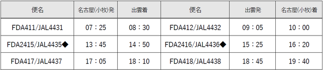 株式会社フジドリームエアラインズ(本社:静岡県静岡市、代表取締役社長:楠瀬 俊一、以下「FDA」)と日本航空株式会社(本社:東京都品川区、代表取締役社長:赤坂 祐二、以下「JAL」)は、2023年11月3日(金)~2024年1月8日(月)の一部日程において、「名古屋(小牧)= 出雲・花巻・高知・熊本」の各路線について、期間増便(JALコードシェア便)を決定しました。